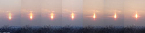![]() ![]() Słup słneczny podczas wschodu Słońca zaobserwowany dnia 06.02.2006 w Lublinie. Zjawisko powstaje podczas odbicia promieni słonecznych od powierzchni kryształów płytkowych lodu. Więcej informacji dostępnych jest na stronie: http://www.atoptics.co.uk/halo/pillar.htm